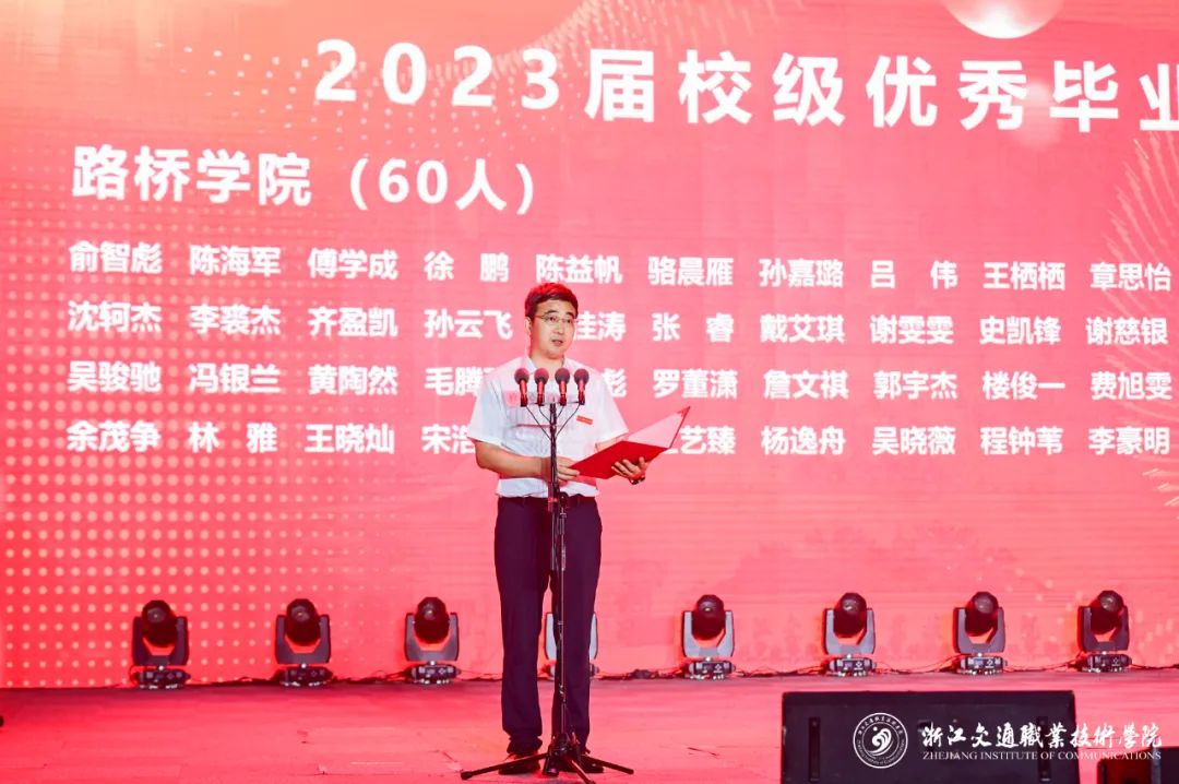 学校党委委员、组织部(宣传统战部)部长严洪广宣读省级、十佳、校级优秀毕业生表彰文件。学校党委委员姚钟华副院长、李锦伟副院长、党委委员工会王亦华主席分别为省级、十佳、校级优秀毕业生代表颁奖。