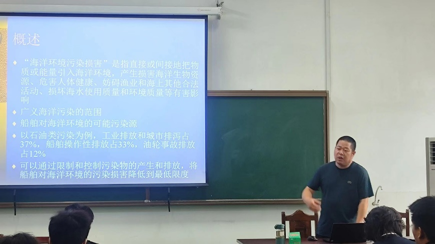 海运学院黄万能老师,从船舶对海洋环境的污染出发,向广大师生介绍MARPOL公约的发展历程,讲解船舶污染海洋的典型案例,阐述防止海洋污染的重要性和具体措施。通过普及海洋环境保护法律知识和技术手段,营造出浓厚的学法守法、保护海洋环境的氛围。
