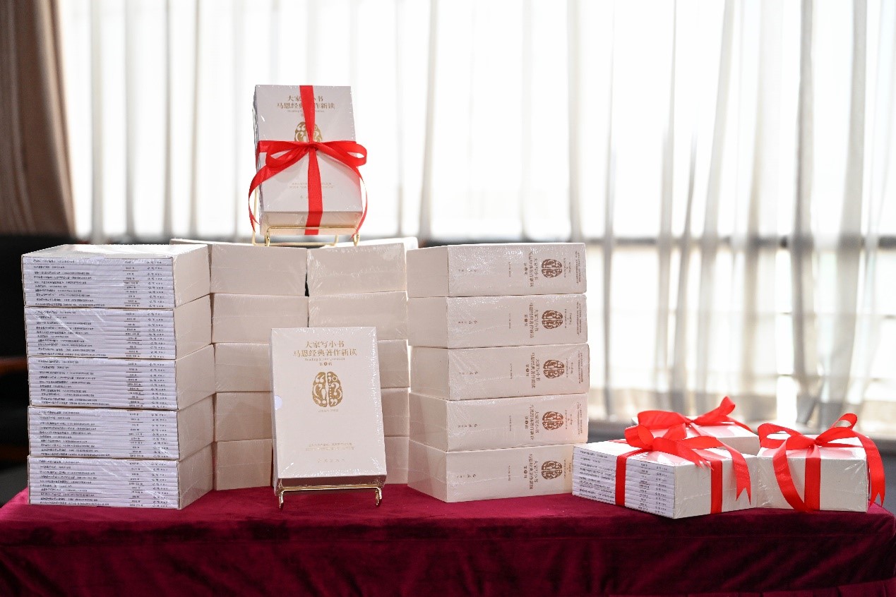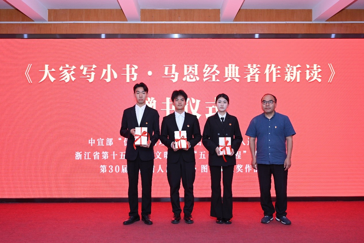 浙江日报报业集团编委、浙江共产党员杂志集团总编辑、红旗出版社社长褚定华向大学生代表赠送了《大家写小书·马恩经典著作新读》丛书第一辑。该书由红旗出版社组织国内权威高校马克思主义学院院长编写,红旗文稿杂志社社长顾保国担任主编,非常适合成为高校马院师生学习马恩经典原著的“启蒙教材”。该书入选中宣部2020年“优秀通俗理论读物出版工程”,并获得浙江省第十五届精神文明建设“五个一工程”奖,第30届浙江树人出版奖图书奖等。