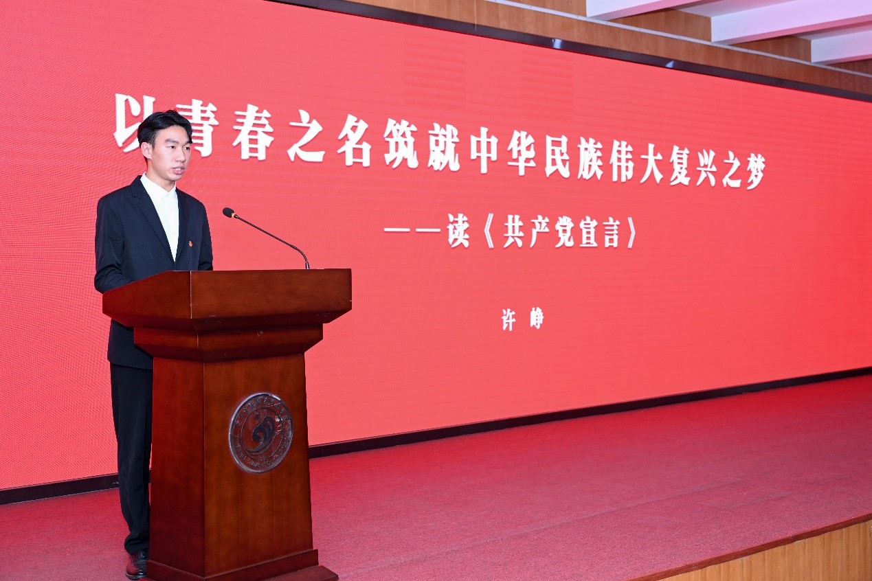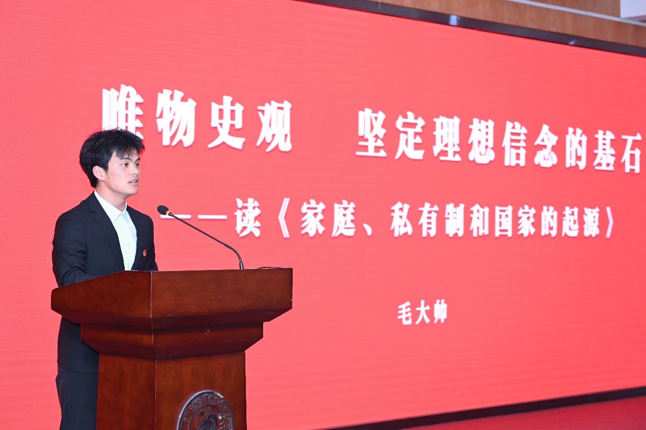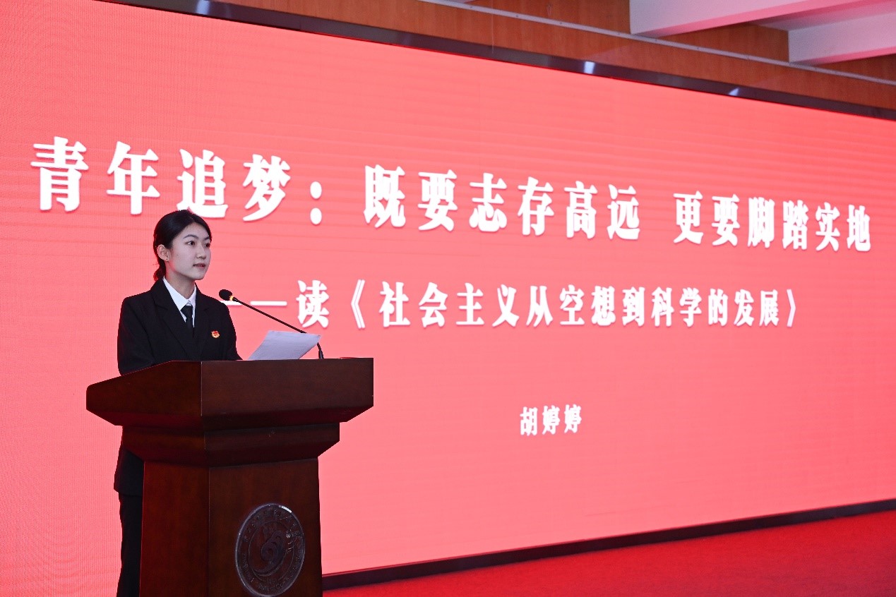 活动现场,路桥学院学生许峥和胡婷婷、运管学院学生毛大帅分别就《共产党宣言》《社会主义从空想到科学的发展》《家庭、私有制和国家的起源》三部马恩经典原著展开宣讲。