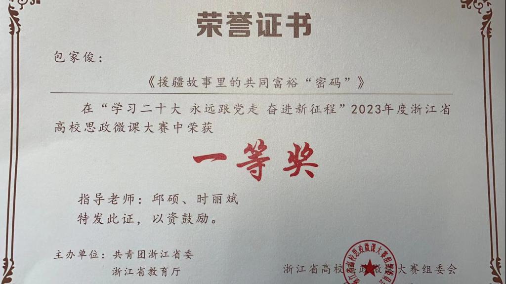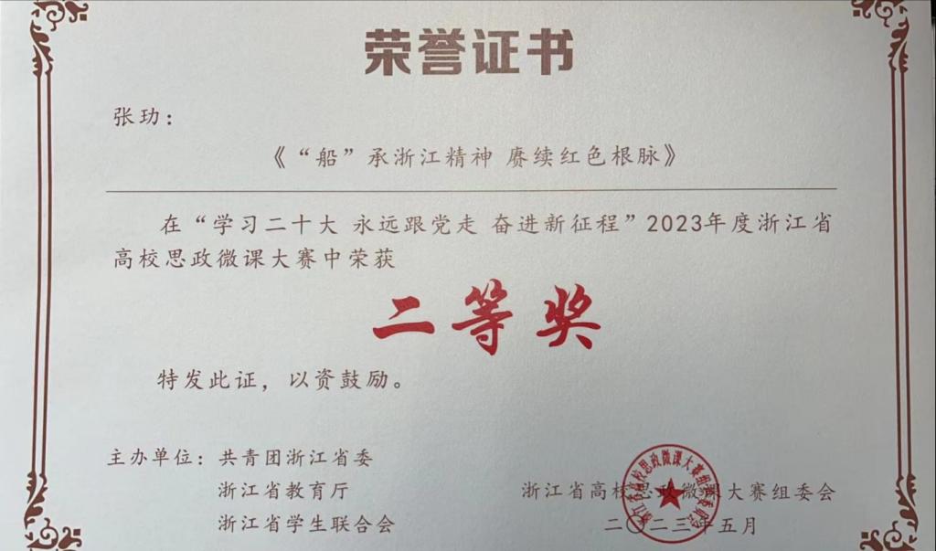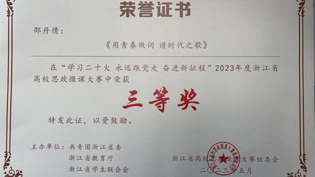 近日,由团省委、省教育厅、省学联联合主办的2023年度浙江省高校思政微课大赛圆满落幕。我校再创佳绩,荣获学生组一等奖,教师组二等奖、三等奖等荣誉。