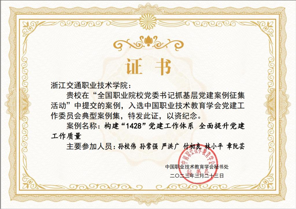 近日,由中国职业技术教育学会党建工作委员会组织开展的全国职业院校党委书记抓基层党建案例征集活动已圆满落幕。经过专家评议,我校提交的案例《构建“1428”党建工作体系 全面提升党建工作质量》成功入选中国职业技术教育学会党建工作委员会典型案例集。