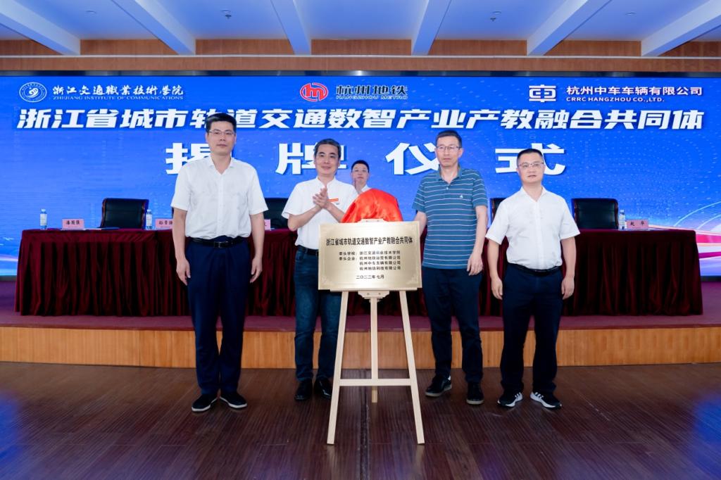 成立大会上,学校党委副书记孙常强与杭州地铁运营有限公司党委书记、董事长徐波,杭州地铁科技有限公司董事长朱佳峰,杭州中车车辆有限公司总工赵华共同为共同体揭牌。