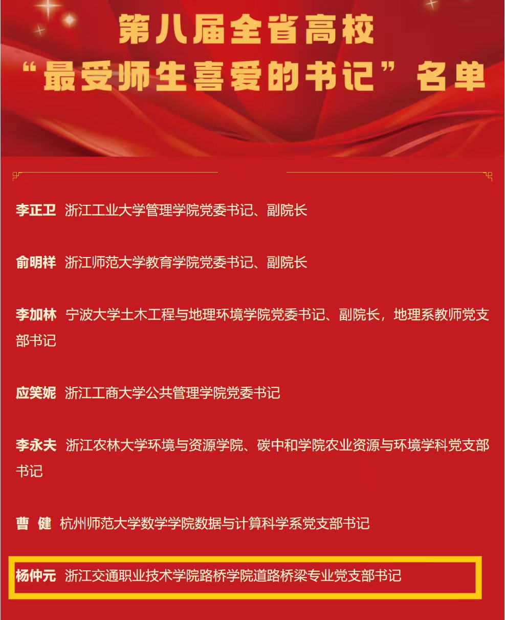 近日,省委教育工委公布了第八届全省高校“最受师生喜爱的书记”名单,我校路桥学院道路桥梁专业党支部书记杨仲元教授成功入选。