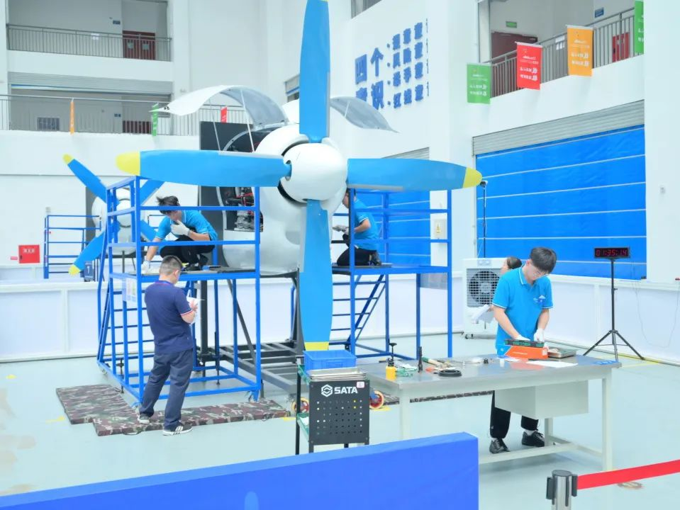 飞机维修赛项由教育部国家发展和改革委员会科学技术部等36个部门主办,四川省教育厅、成都市人民政府承办、成都航空职业技术学院协办,共有来自全国25个省份的47支队伍同台竞技。该赛项旨在服务建设航空强国、民航强国的国家战略,对接航空维修领域新技术、新产业、新业态、新模式,培养“能工巧匠”“大国工匠”等技术技能型人才。大赛赛项共设置有飞机铆装结构修理、飞机标准线路施工、飞机发动机检修及机务检查3个模块,具体考核标准、细则完全对照最新的民用航空和航空行业标准,每个模块考核时间最多不超过120分钟,赛题覆盖面广,不仅能够检验选手技术技能,还考验团队协作、组织协调能力以及安全意识和质量意识。