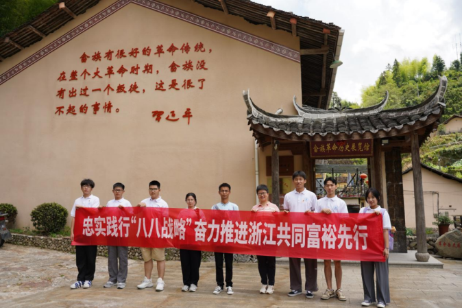 在四明山革命老区——横坎头村,实践团了解到,20年前,横坎头村是一个交通闭塞、房屋破旧、村民收入低的经济薄弱村,连条水泥路都没有。20年后的今天,横坎头村已获得“全国文明村”、“浙江省首批未来乡村”等诸多荣誉。过去20年,横坎头村深入践行八八战略,以“千万工程”为抓手,从村庄面貌整治入手,坚定不移走“红色引领+绿色发展”道路,按照“发展红色旅游,利用绿色资源,壮大特色产业”的思路,不断壮大产业发展新动能,不仅把自身打造成为富裕、文明、宜居的美丽乡村,还携手周边村和对口帮扶村一起在共同富裕的大道上阔步前行,完成了从整洁有序到强村富民再到引领共富的“三级跳”。
