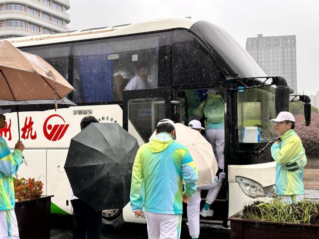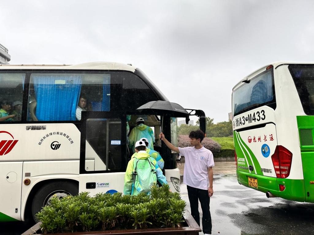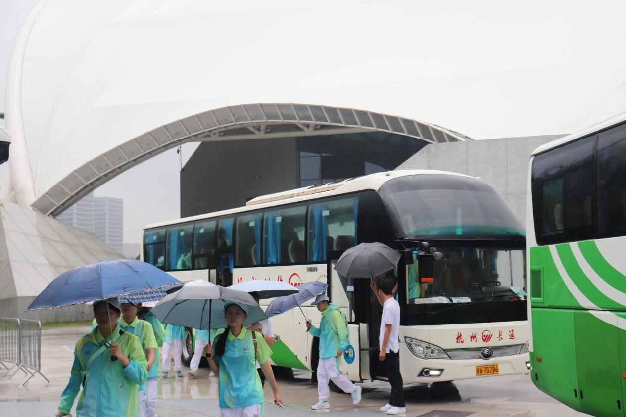 8月30日清晨,迎着秋日的雨水,我院“小青荷”们身着靓丽的志愿服务服装统一乘坐大巴车前往拱墅运河体育公园体育场参加综合演练。志愿者们互助友爱,在雨中为小伙伴们撑伞,紧张而繁忙的一天在温暖友爱中开始了。