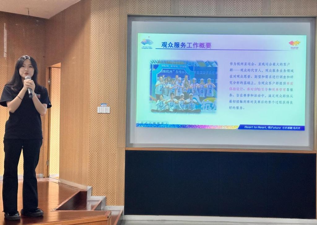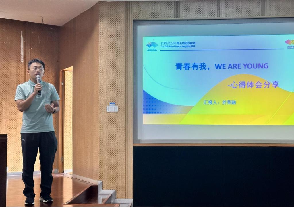9月1日下午,在yl6809永利官网小礼堂举行亚运会志愿者“每日之星”经验分享交流会,共有来自竞赛技术运行、反兴奋剂、观众服务等8个领域的志愿者“每日之星”上台分享,骨干志愿者洪银香同学主持,志愿者领队教师邵丹倩、赵玲君出席交流会,全体亚运会志愿者参加。
