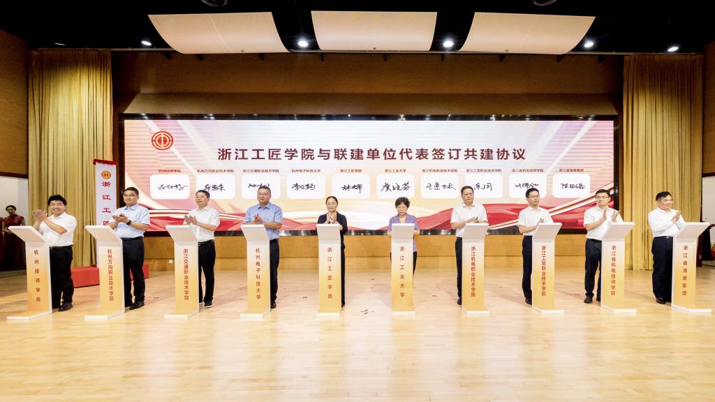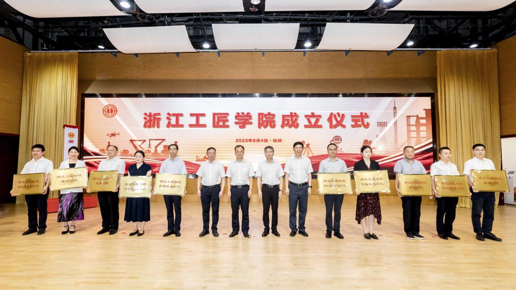 为深入贯彻实施党的十九大提出的“弘扬劳模精神和工匠精神”决策部署,努力打造“具有浙江辨识度、产教融合、协同发展的新型工匠培训培育学院”,9月4日,浙江工匠学院成立仪式于浙江省职工服务中心隆重举行。全国总工会副主席(兼)、中国航天科技集团有限公司第一研究院首席技能专家高凤林,省人大常委会副主任、省总工会主席刘忻出席仪式并致辞;副省长王文序为浙江工匠学院揭牌,为“劳模工匠助企行”专项行动授旗。我校党委副书记、院长陈凯和党委委员、工会主席王亦华作为浙江工匠学院联建单位领导参会。