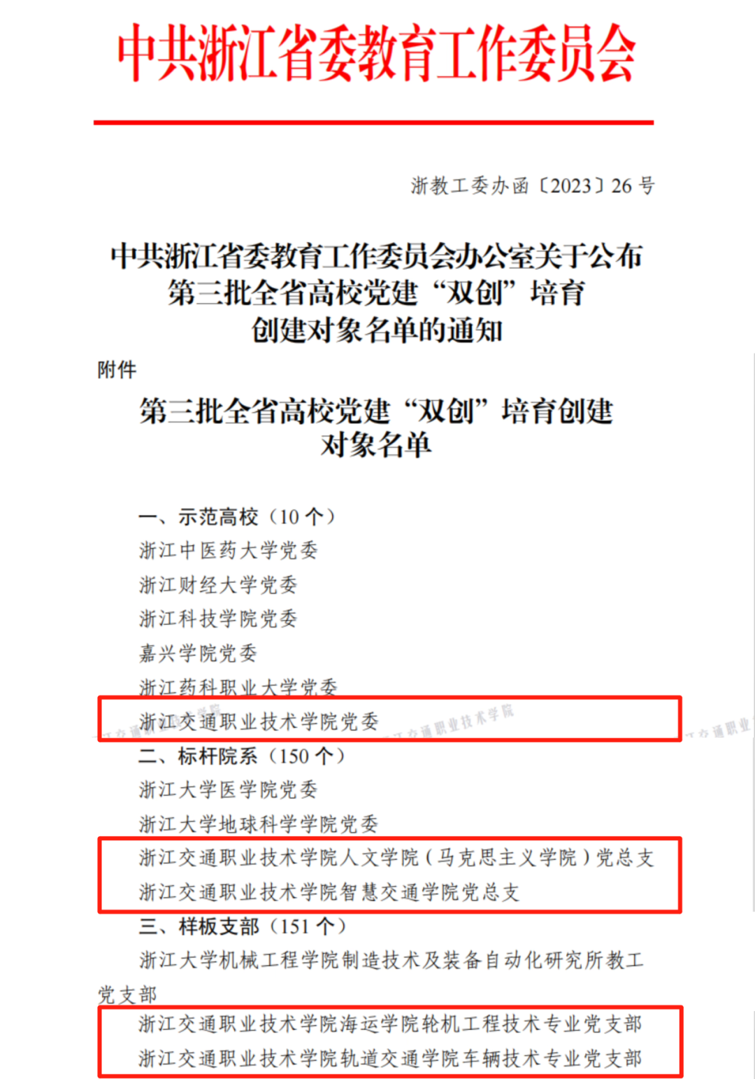 近日,省委教育工委公布了第三批全省党建“双创”培育创建单位名单,yl6809永利官网党委入选全省示范高校培育创建单位,智慧交通学院党总支、人文学院(马克思主义学院)党总支入选全省党建工作标杆院系培育创建单位,海运学院轮机工程技术专业党支部、轨道交通学院车辆技术专业党支部入选全省党建工作样板支部培育创建单位。