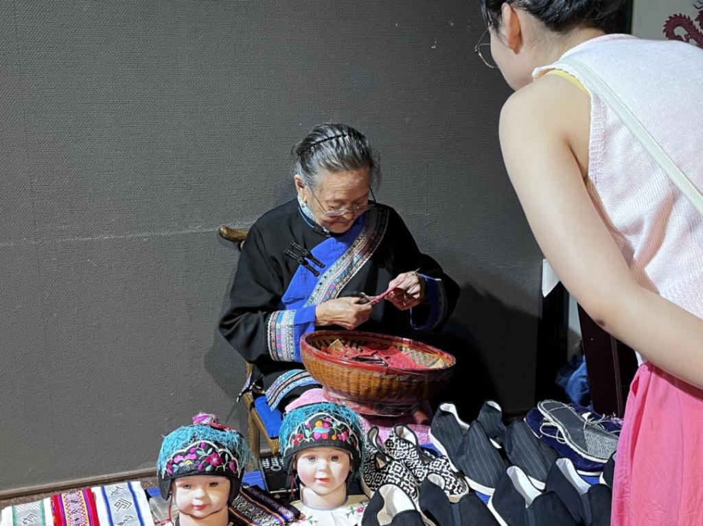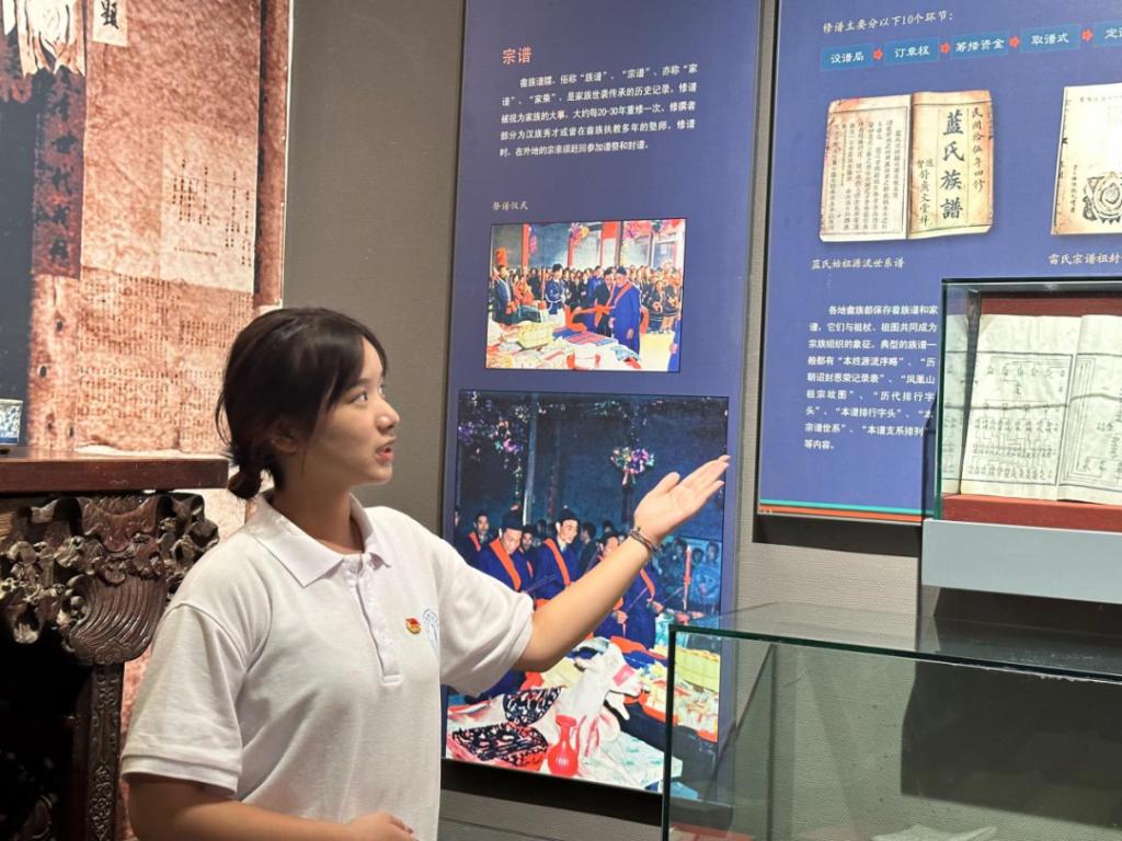 在实践活动期间,杜成琳同学来到畲族博物馆体验讲解员工作。景宁畲族博物馆是一座以畲族文化历史为切入点,全面展示中国畲族文化和民俗风情的综合型博物馆。展厅以畲族民俗为主题,畲族发展史为主线。讲述“迁徙与分布”、“环境与聚居”、“生产与交换”、“饮食与服饰”、“风习与信仰”、“文化与艺术”等畲族故事。展馆内还有几位奶奶在现场编织彩带。她们向我们介绍到:制作一条彩带需要七八天的时间,制作工艺繁琐,彩带上的图案基本上是畲族的文字,成品非常精美。
