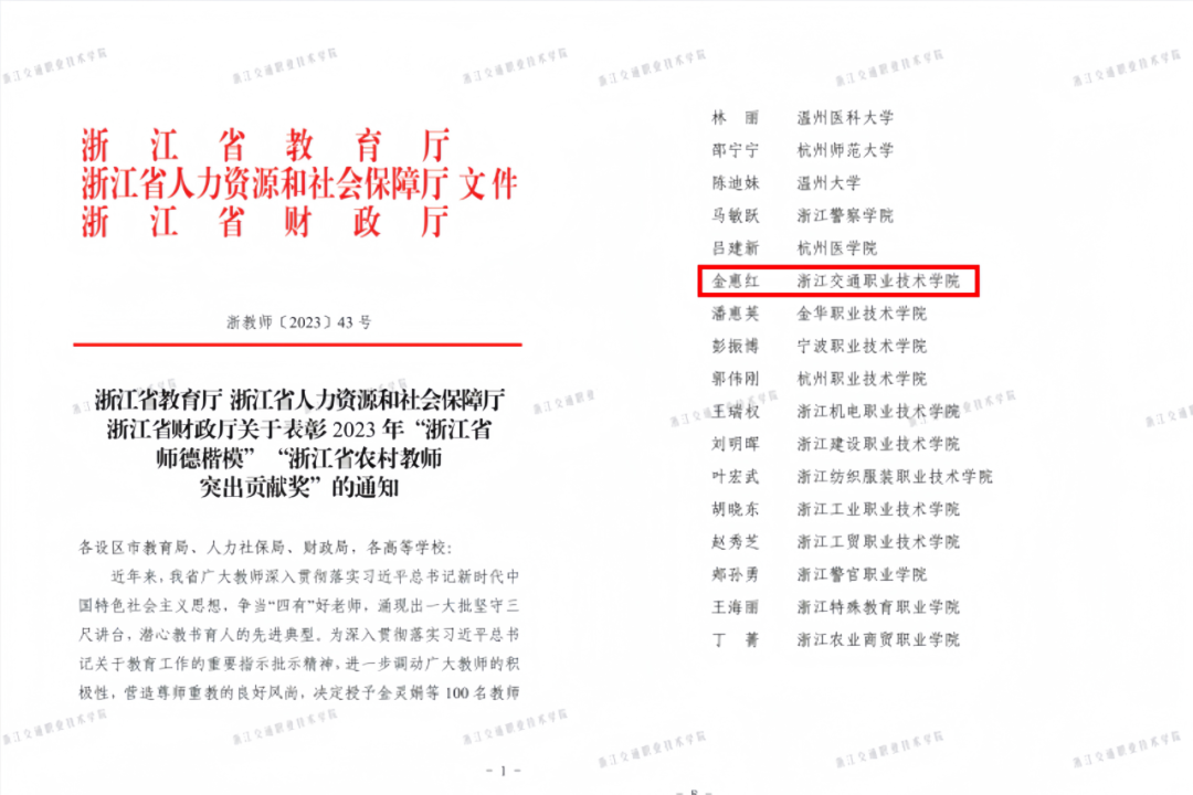 近日,浙江省教育厅、浙江省人力资源和社会保障厅、浙江省财政厅公布表彰了100名教师为2023年“浙江省师德楷模”称号、100名教师为“浙江省农村教师突出贡献奖”称号,我校人文学院数学教研室主任金惠红教授荣获“浙江省师德楷模”荣誉称号。