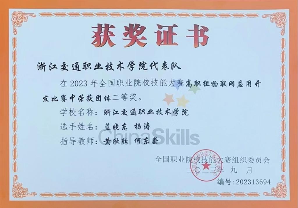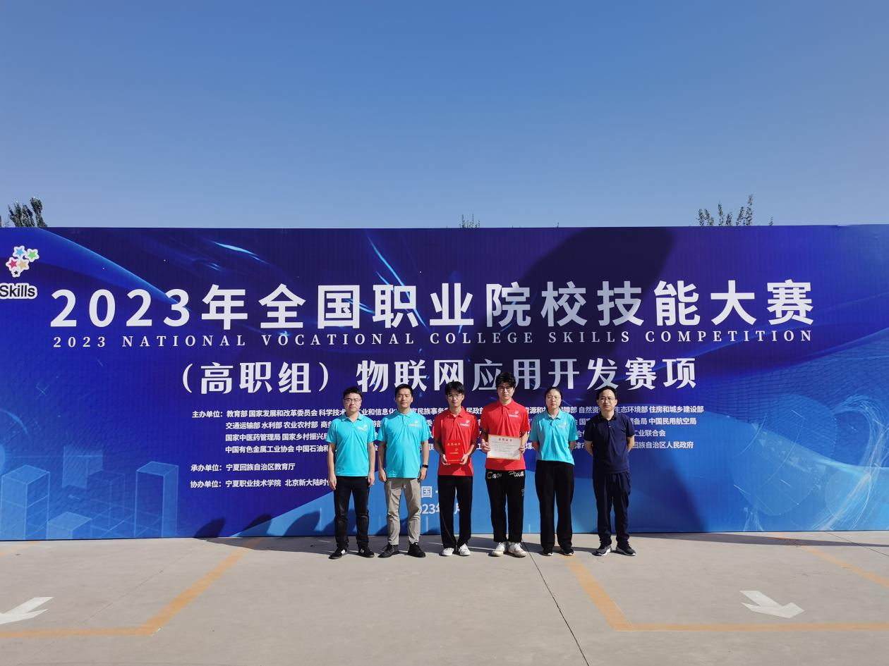 2023年9月12日,由教育部、宁夏回族自治区人民政府、国家发改委等36部委和协会共同举办的2023年全国职业院校技能大赛(高职组)“物联网应用开发”赛项在宁夏职业技术学院成功举办,来自全国29个省市自治区和新疆生产建设兵团共计59支代表队的118名选手同台竞技。智慧交通学院刘大学副院长、物联网应用技术专业洪顺利主任带队参赛。经过激烈角逐,黄欣欣、何东蔚老师指导的蓝晓东、杨涛两位同学获得全国二等奖。这是继2022年获得全国一等奖后,我校在该赛项再获国奖,充分展现了物联网应用技术专业“岗课赛证融合”教学改革的良好成效。