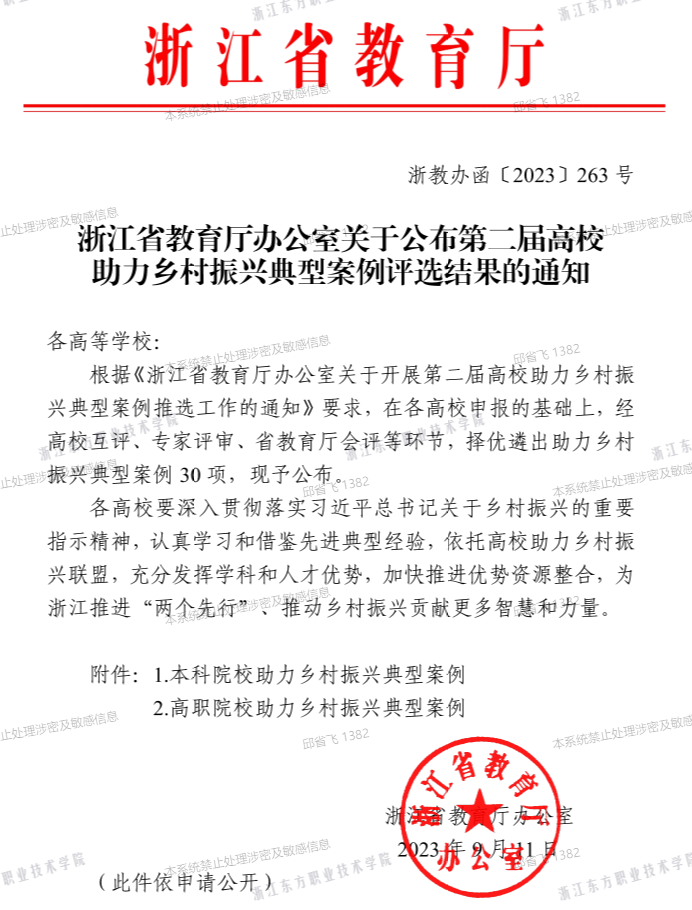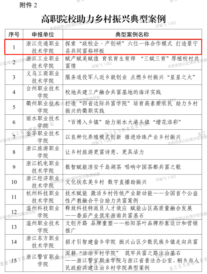 近日,浙江省教育厅公布了第二届高校助力乡村振兴典型案例评选结果,本次入选的本科院校共有15所,高职院校共有15所,其中我校上报的《探索“政校企・产创研”六位一体合作模式,打造景宁县共同富裕样板》典型案例在高职院校中排序第一。