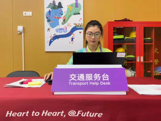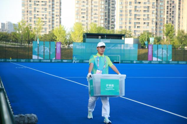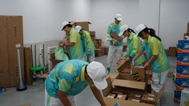 体育展示与颁奖仪式领域“小青荷”协助工作人员准备颁奖物资、嘉宾管理、挂熨烫服装、布置旗帜;竞赛技术运行领域“小青荷”协助领域老师为场地里的运动员提供服务;医疗卫生和公共卫生领域“小青荷”正在核对急救物资,为有需要的人提供急救服务。