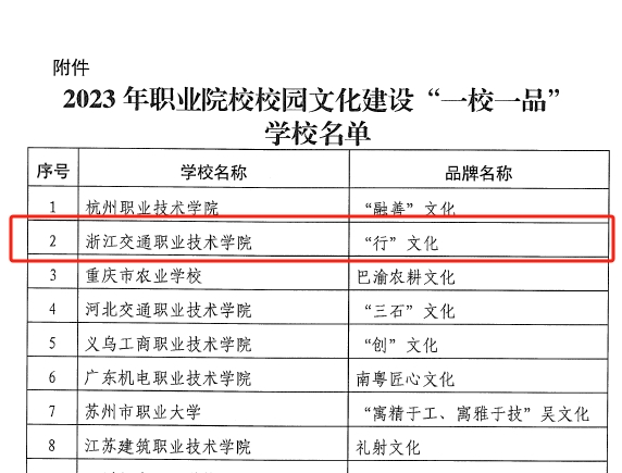 近日,教育部职业院校文化素质教育指导委员会公布2023年职业院校校园文化建设“一校一品”典型案例申报结果,我校“行”文化成功入选。