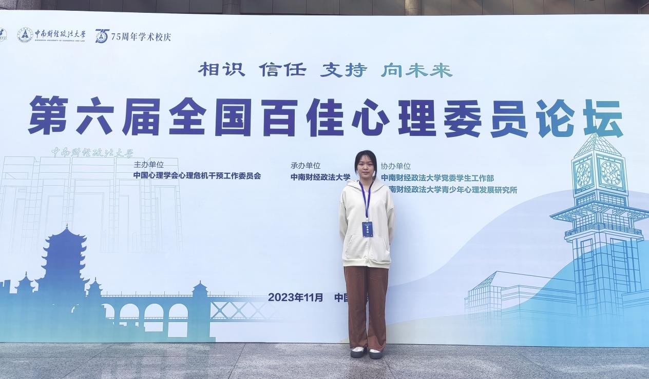 11月1日到3日,由中国心理学会心理危机干预工作委员会主办、中南财经政法大学承办的第十八届全国高校心理委员工作研讨会暨朋辈辅导论坛、第六届全国百佳心理委员论坛在武汉召开,经过网络投票、视频材料展示、大会专家组评审,我校路桥学院市政工程技术专业2211401班的丁欣莹同学在全国近400名高校心理委员的角逐中脱颖而出,荣获第六届“全国百佳心理委员”荣誉称号。