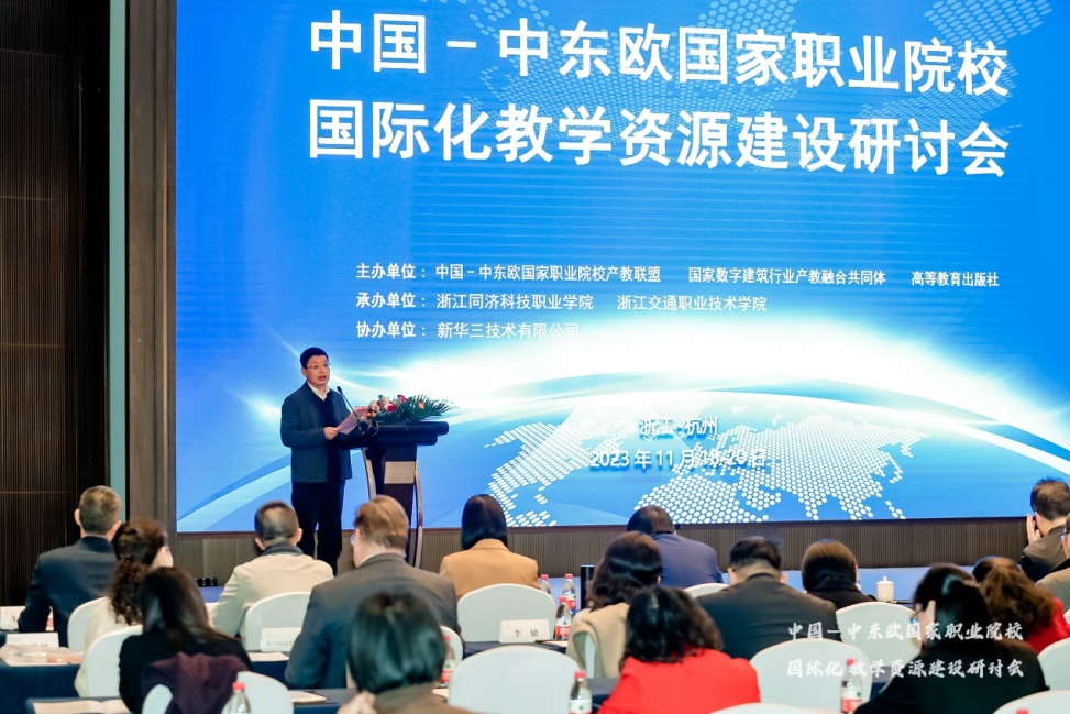 11月19日,中国-中东欧国家职业院校国际化教学资源库建设研讨会暨国际化项目校社合作签约会在杭州举行。此次活动以“国际化教学资源建设与共享”为主题,由中国-中东欧国家职业院校产教联盟、国家数字建筑行业产教融合共同体、高等教育出版社主办,yl6809永利官网与浙江同济科技职业学院承办。会议邀请了教育部职业教育发展中心赵长兴研究员、中国教育科学院职业教育与继续教育研究所宗诚博士、天津高职教育研究会戴裕葳会长、教育部信息化教指委曹喆副主任等专家学者莅临作专题报告。