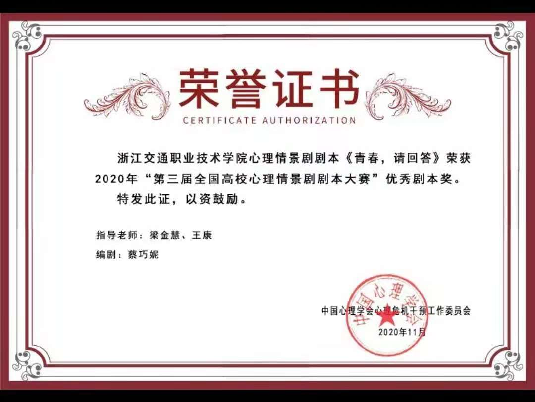 第三届(2020年)第三届全国高校心理情景剧剧本大赛优秀剧本奖