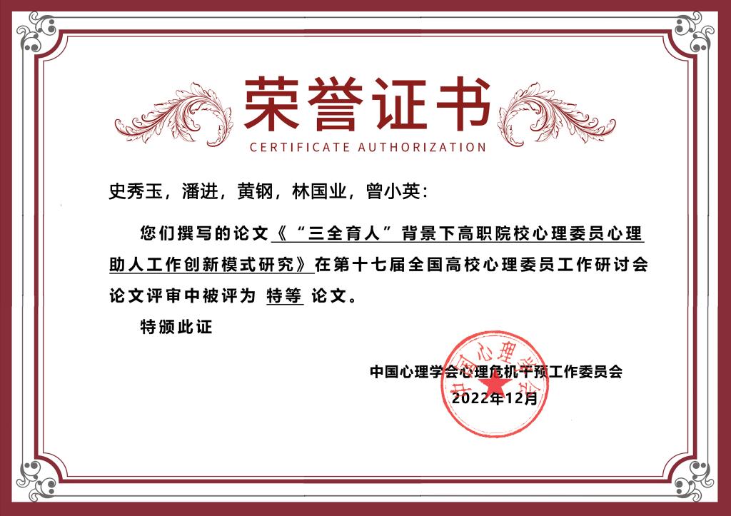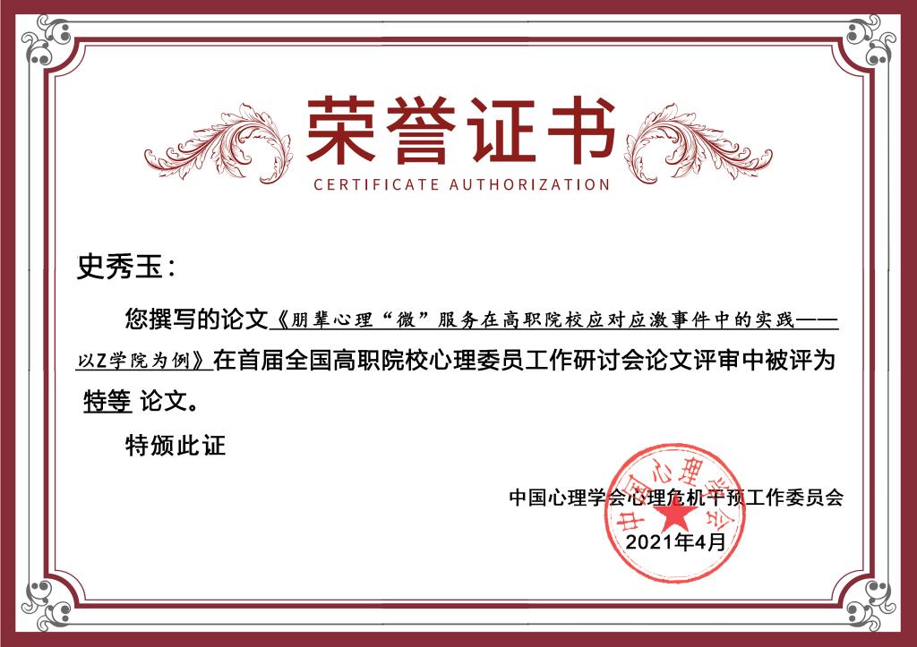 (2021年4月)首届全国高职院校心理委员工作研讨会会议论文特等奖