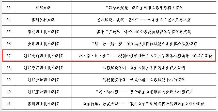 近日,教育部公布2024年度高校思想政治工作质量提升综合改革与精品建设项目遴选名单,我校《“思·悟·创·生”——校园心理情景剧在人际关系团体心理辅导中的应用案例》成功入选获“2024年度高校学生心理健康教育指导典型案例”。