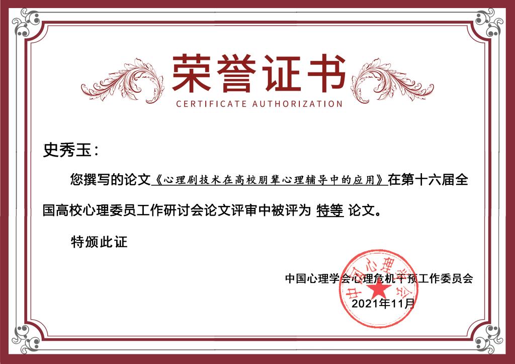 (2021年11月)第十六届全国高校心理委员工作研讨会会议论文特等奖