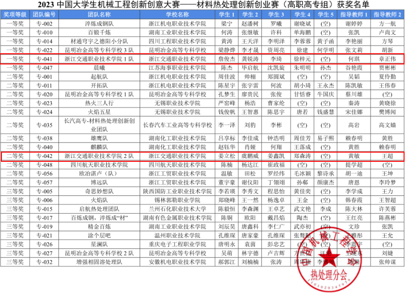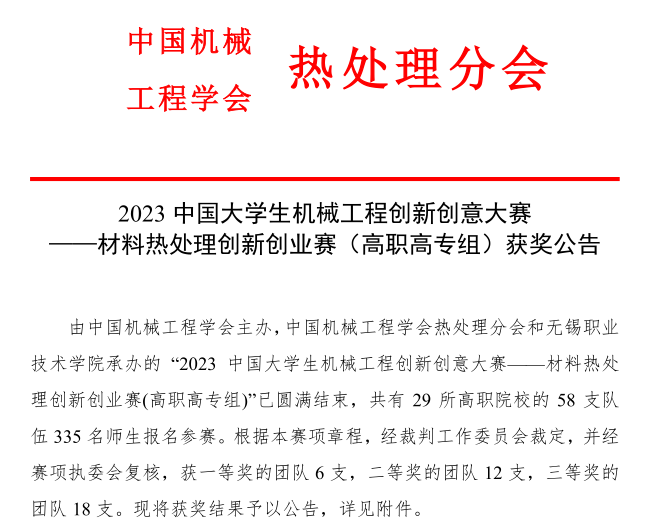 中国大学生机械工程创新创意大赛——材料热处理创新创业大赛始办于2015年,是一项面向全国高校材料科学与工程及相关专业在校生的竞赛活动,材料热处理创新创业赛已成为我国材料热处理卓越人才培养的重要组成部分,自2019年持续纳入《全国普通高校大学生竞赛排行榜》,受到高校和行业的普遍关注。该项赛事(高职高专组)2023年首次开赛,比赛内容涵盖制造业关键零部件的热处理工艺、表面改性工艺技术开发,共有29所高职院校的58支队伍335名师生报名参赛,共评选出一等奖6项,二等奖12项,三等奖18项。
