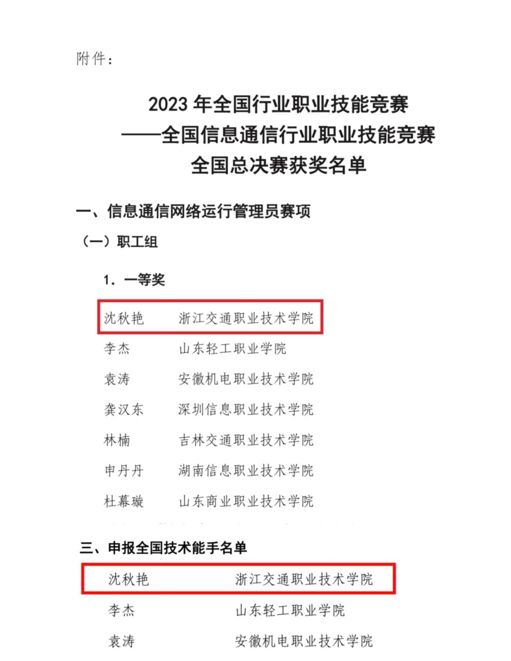 12月18日,据中国通信学会发布的《关于公布2023年全国行业职业技能竞赛——全国信息通信行业职业技能竞赛全国总决赛获奖名单的通知》,我校沈秋艳老师在人力资源社会保障部组织开展的2023年全国行业职业技能竞赛全国信息通信行业职业技能竞赛中,勇夺信息通信网络运行管理员(移动通信技术方向)全国总决赛职工组第一名,将按有关程序申报并经人力资源社会保障部核准后授予“全国技术能手”称号,实现零的突破!