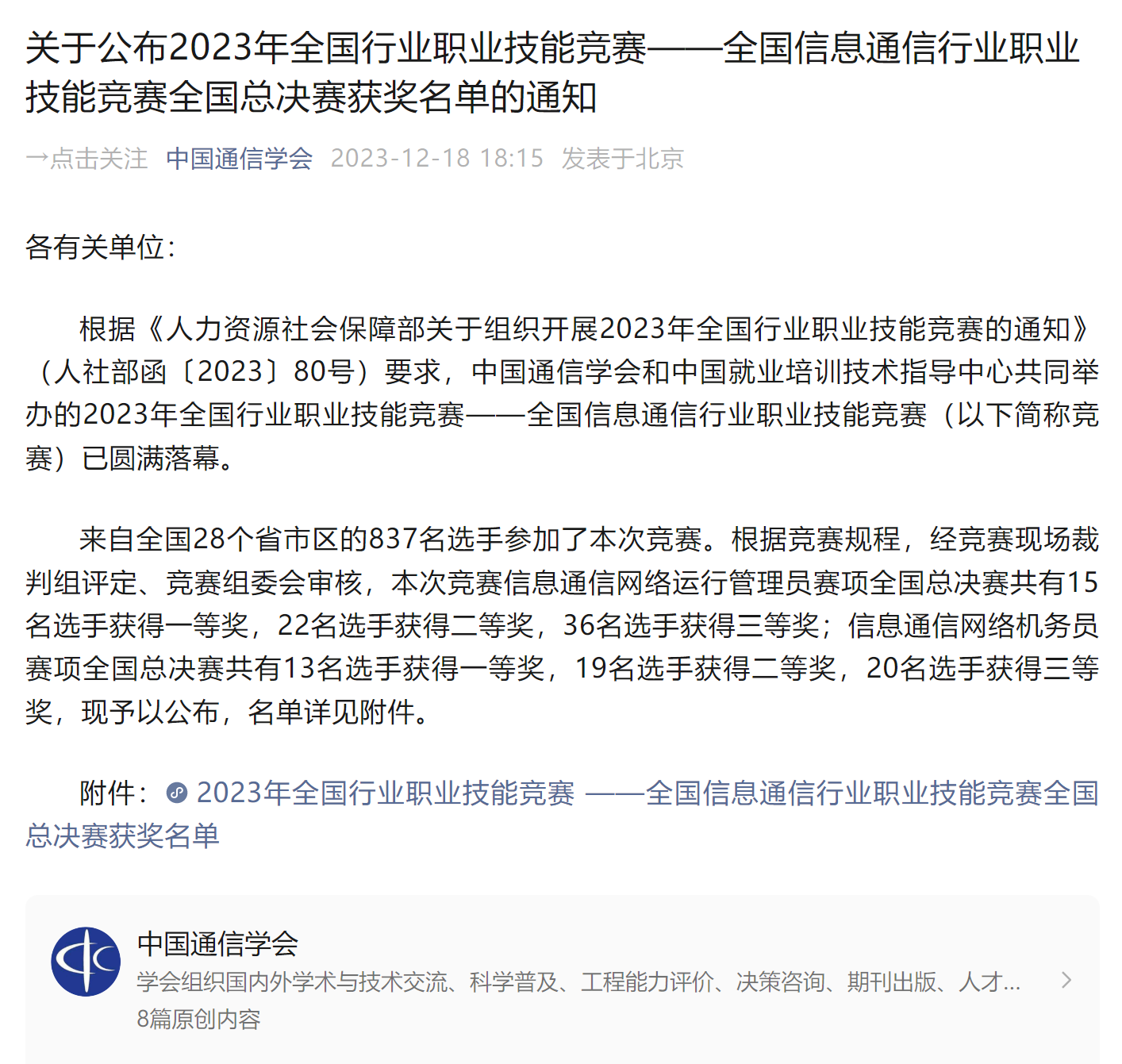 根据《人力资源社会保障部关于组织开展2023年全国行业职业技能竞赛的通知》(人社部函[2023]80号)部署,由中国通信学会和中国就业培训技术指导中心共同举办的全国信息通信行业职业技能竞赛全国总决赛于11月25日-29日在山东淄博市举行。经前期全国各地近300人预赛选拔后,共有来自全国23个省、市、自治区、新疆生产建设兵团的65支代表队入围本次全国总决赛。