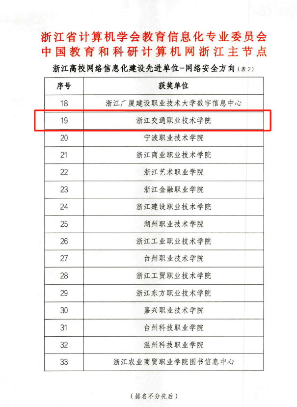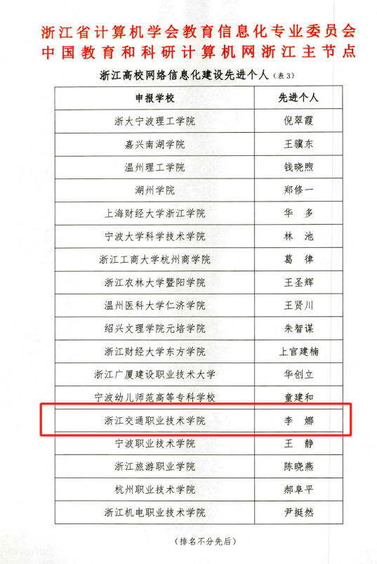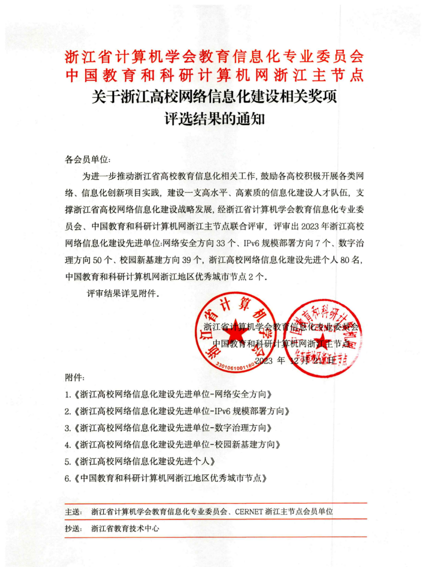 近日,经浙江省计算机学会教育信息化专业委员会、中国教育和科研计算机网浙江省节点联合评审,我校荣获“2023年浙江高校网络信息化建设先进单位-网络安全方向”荣誉称号,李娜老师获评“浙江高校网络信息化建设先进个人”荣誉称号。
