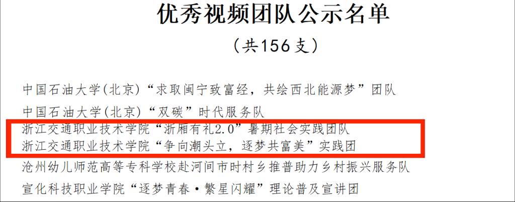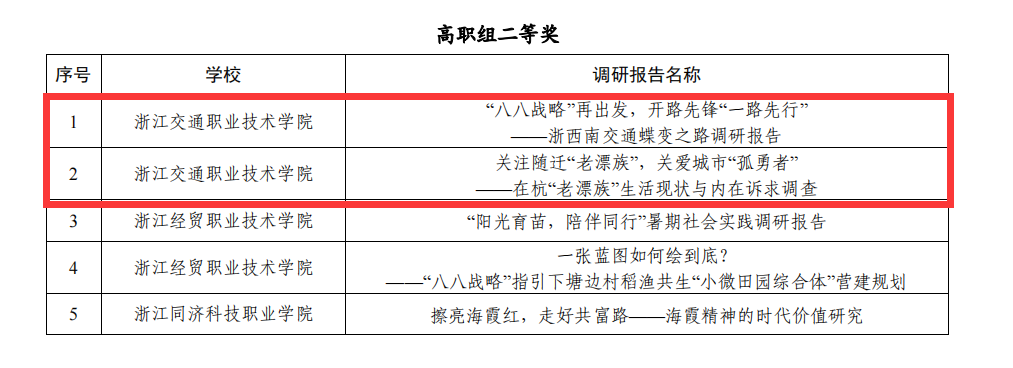 由中共浙江省委宣传部、浙江省文明办、浙江省教育厅、共青团浙江省委、浙江省关心下一代工作委员会和浙江省学生联合会主办的2023年浙江省高校暑期社会实践优秀调研报告评选中,我校共有3支队伍过关斩将、从全省94所高校限额推报的606份调研报告中突出重围,荣获一等奖1项,二等奖2项,创我校在浙江省暑期社会实践赛事中的最好成绩,其中: