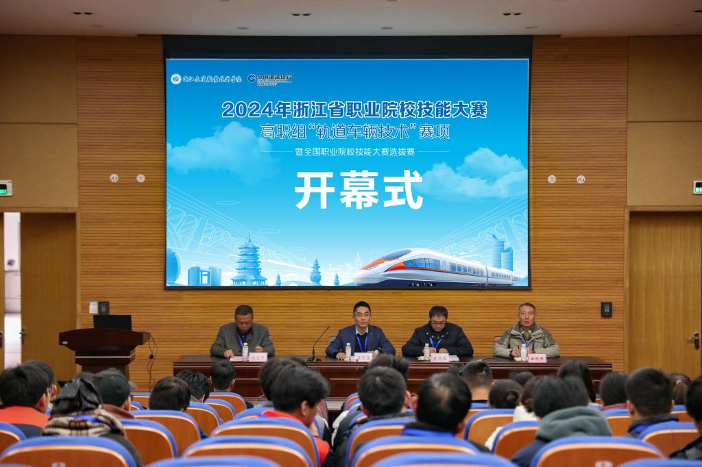 匠心成就梦想,技能创造未来。3月1日,2024年浙江省职业院校技能大赛高职组“轨道车辆技术”赛项在我校隆重开赛,学校党委委员、副校长潘国强、教务处副处长(主持工作)袁道福、轨道交通学院院长白继平、党总支书记徐晓峰、裁判代表、组委会成员、各参赛院校领队和选手参加开幕式,开幕式由袁道福副处长主持。