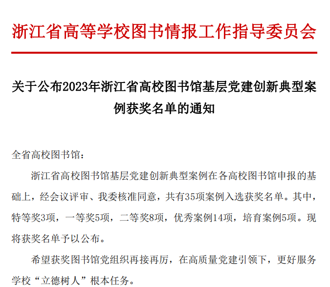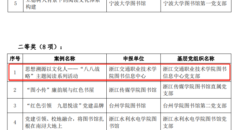 浙江省高校图书馆基层党建创新典型案例评选结果公布,我校图信中心党支部申报的“思想溯源以文化人——“八八战略”主题阅读”系列活动荣获二等奖,在全省高校中列第9位、全省高职院校中列第2位。此次申报,全省共有35项案例入选获奖名单。