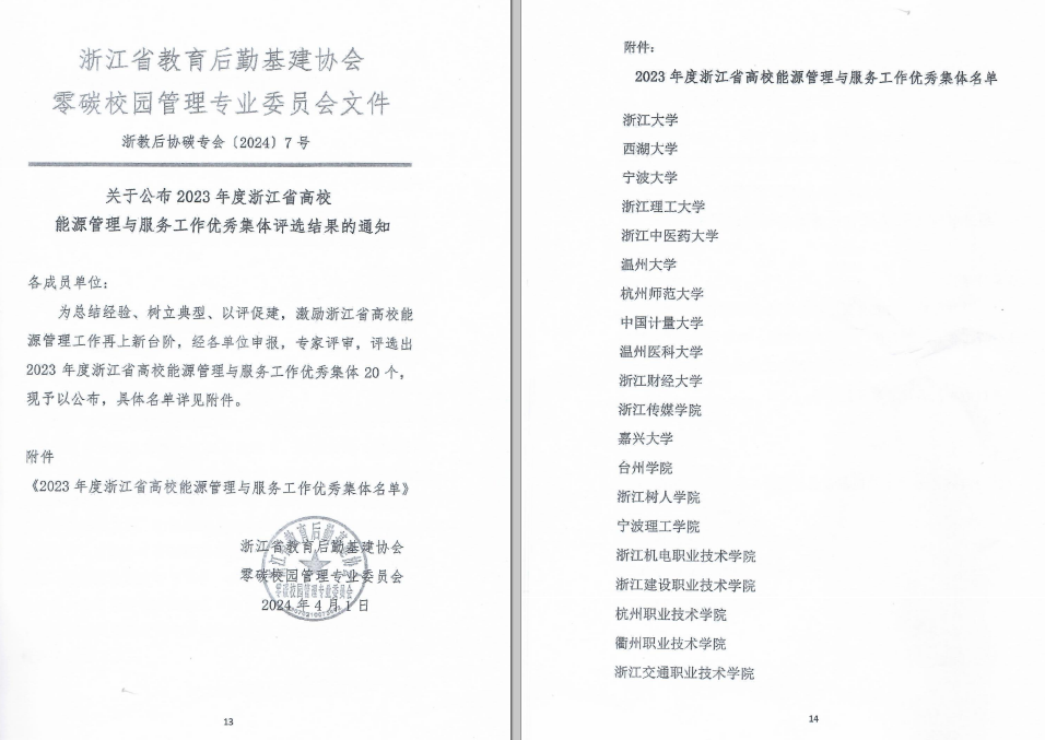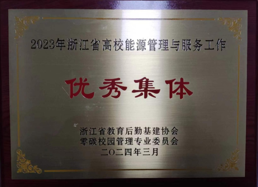 近日,浙江省教育后勤基建协会零碳校园管理专业委员会成员代表大会暨能源管理工作会议在台州举行。会上,我校被授予“能源管理与服务工作优秀集体”荣誉称号,这是我校继荣获“浙江省绿色学校(高等学校)三星级”称号,成功创建“2022年度省级公共机构节水型单位”、“2023年度节水型高校”,并顺利入选浙江省年度节水型高校和节水标杆单位后,获得的又一殊荣,是对我校在节能降碳、绿色可持续发展领域所做工作的高度认可。