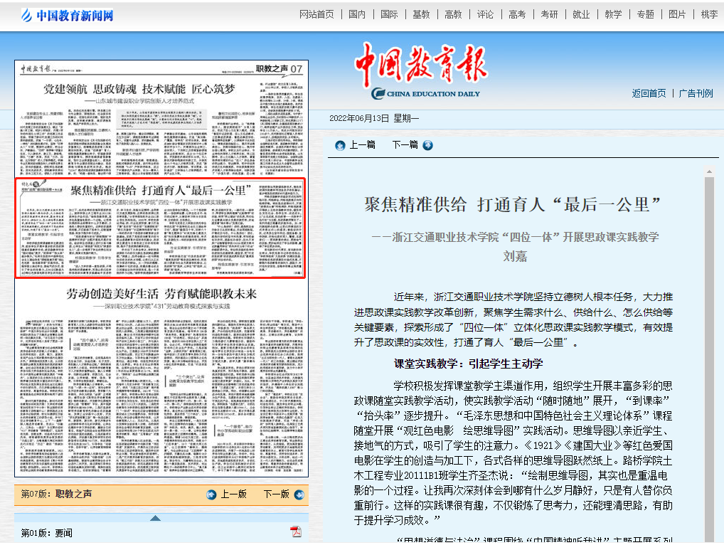 下一条:现代高等职业教育网:聚焦精准供给 打通育人“最后一公里”——浙江交通职业技术学“四位一体”开展思政课实践教学