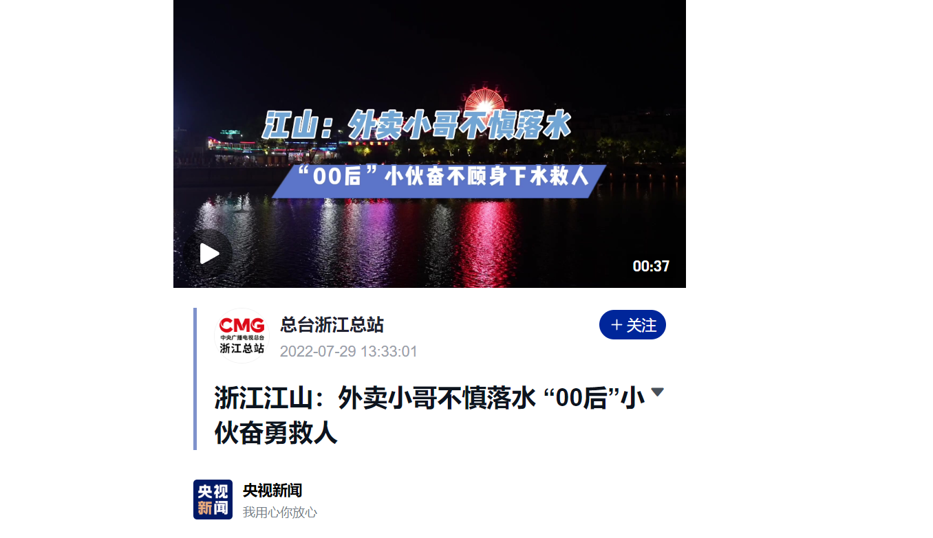 下一条:浙江新闻:点赞 外卖小哥不慎落入须江 大学生纵身一跃跳江救人
