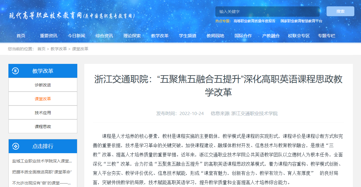 下一条:现代职教网:“五聚焦五融合五提升”深化高职英语课程思政教学改革