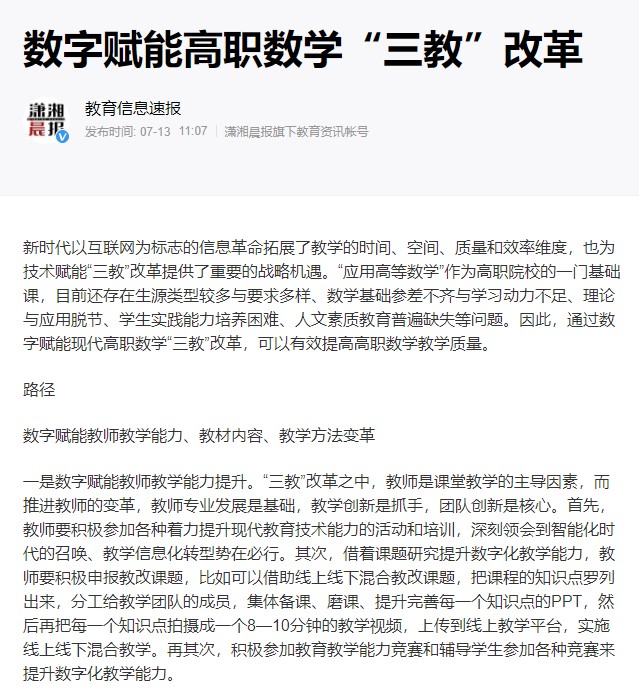 上一条:职教圈:数字赋能高职数学“三教”改革