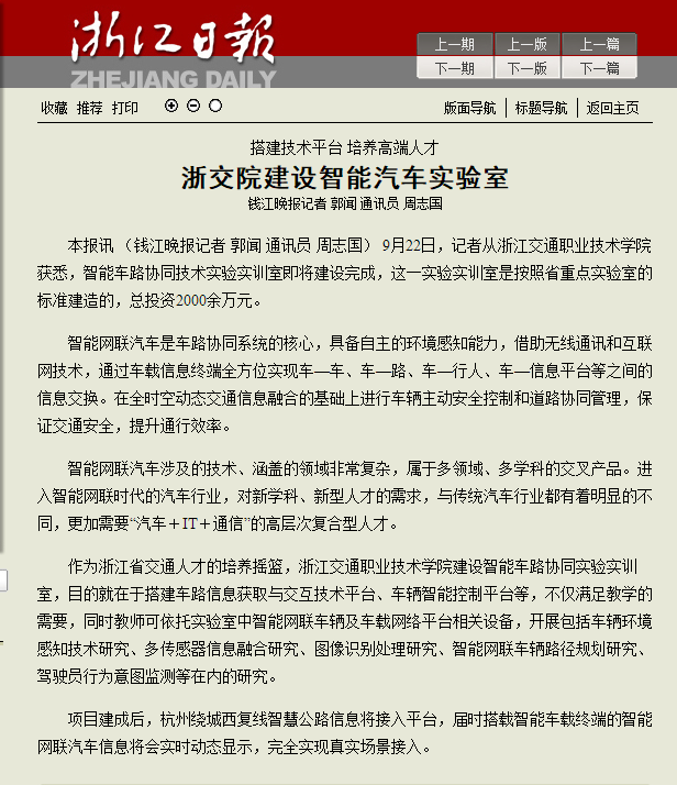 上一条:浙江新闻:搭建技术平台 培养高端人才 浙我院建设智能汽车实验室