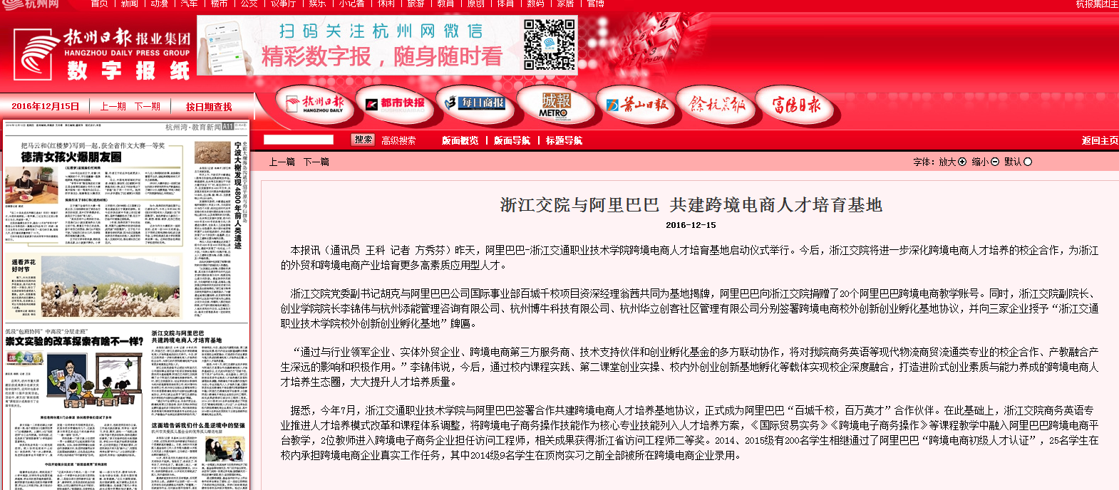 杭州日报:yl6809永利官网与阿里巴巴 共建跨境电商人才培育基地