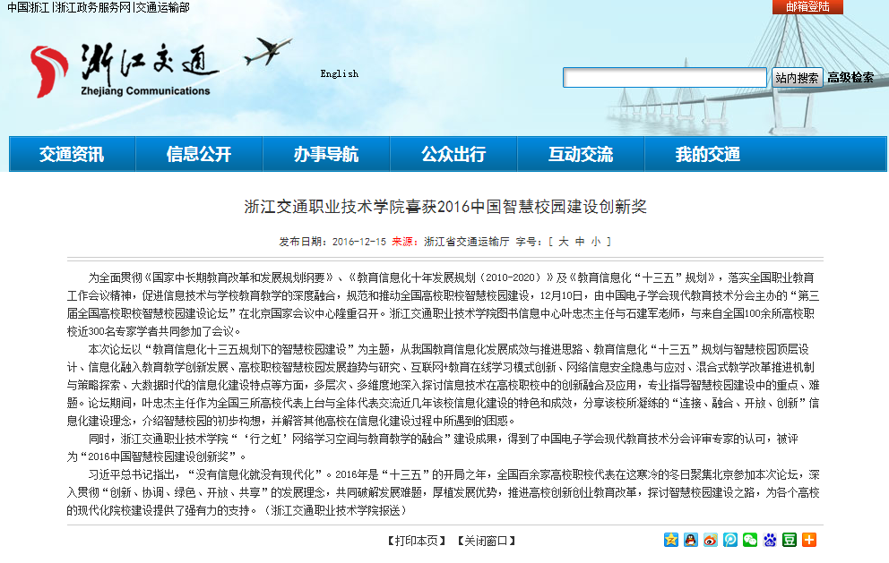 浙江交通:yl6809永利官网喜获2016中国智慧校园建设创新奖