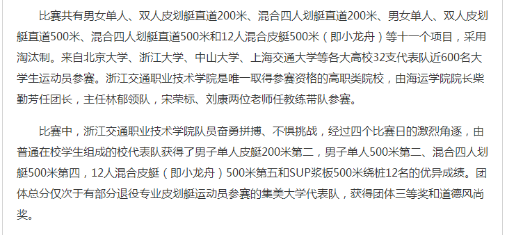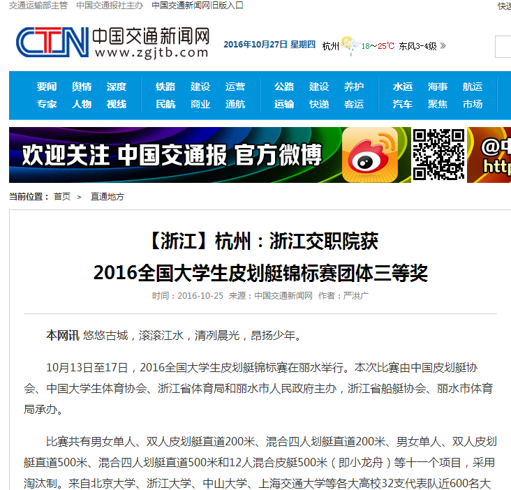 中国交通新闻网:浙江交职院获2016全国大学生皮划艇锦标赛团体三等奖