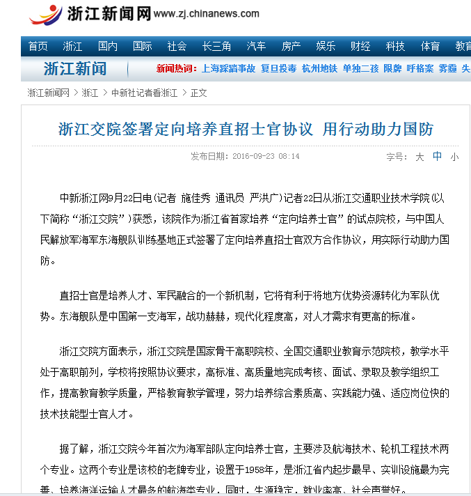 浙江新闻网:yl6809永利官网签署定向培养直招士官协议 用行动助力国防