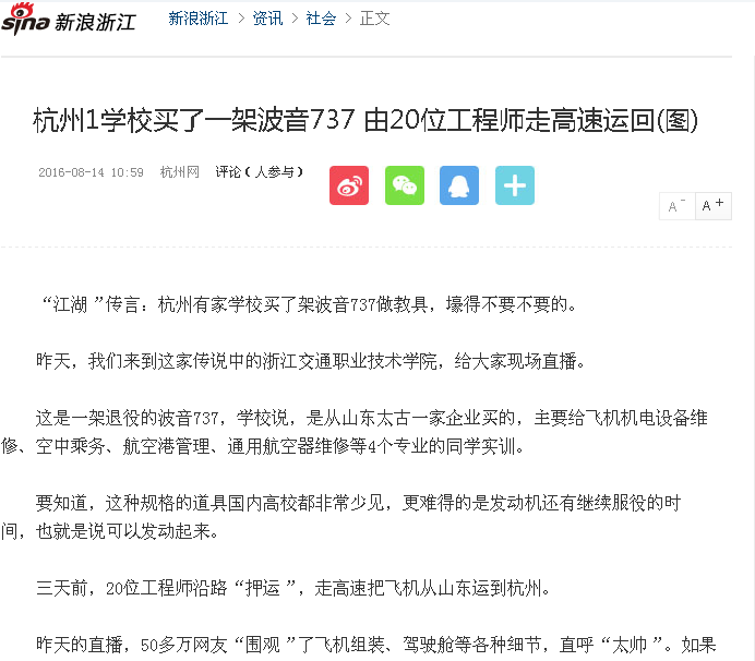 新浪、19楼等媒体关注我校波音737飞机入场