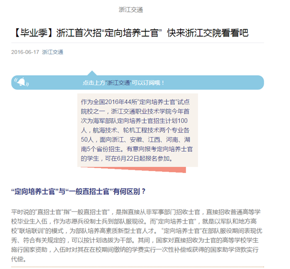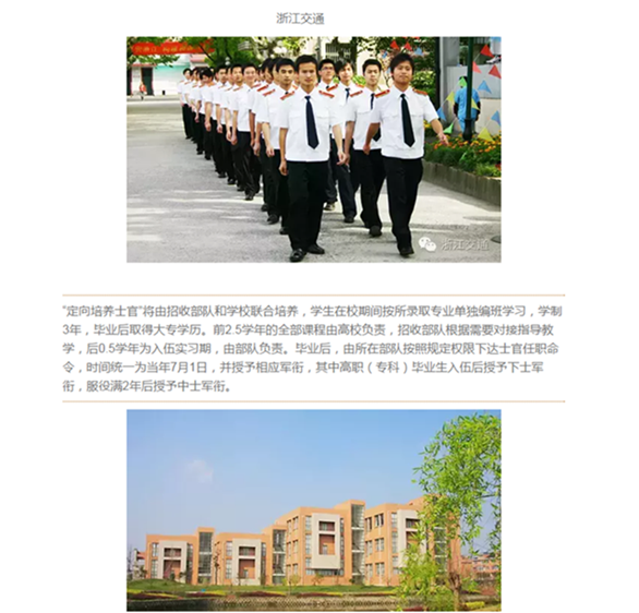 浙江在线:浙我院2016年首招“定向培养士官”面向浙江等5省招生100人
