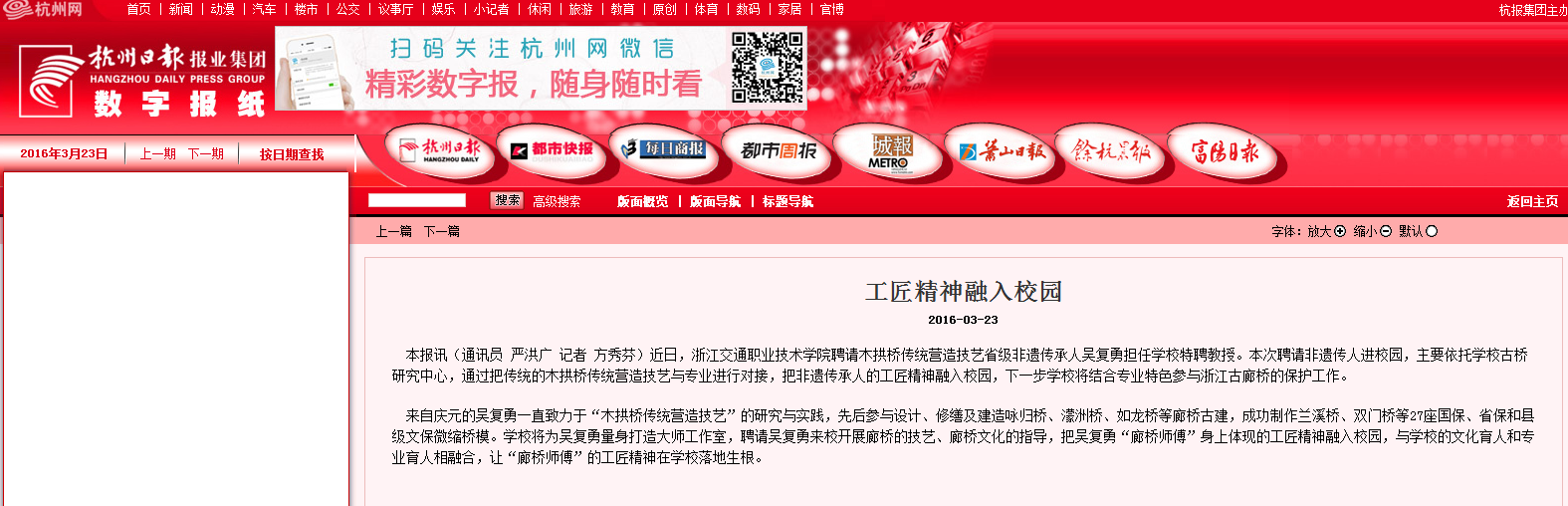 浙江在线等新闻媒体关注我校聘请木拱桥传统营造技艺省级非遗传人吴复勇担任学校特聘教授
