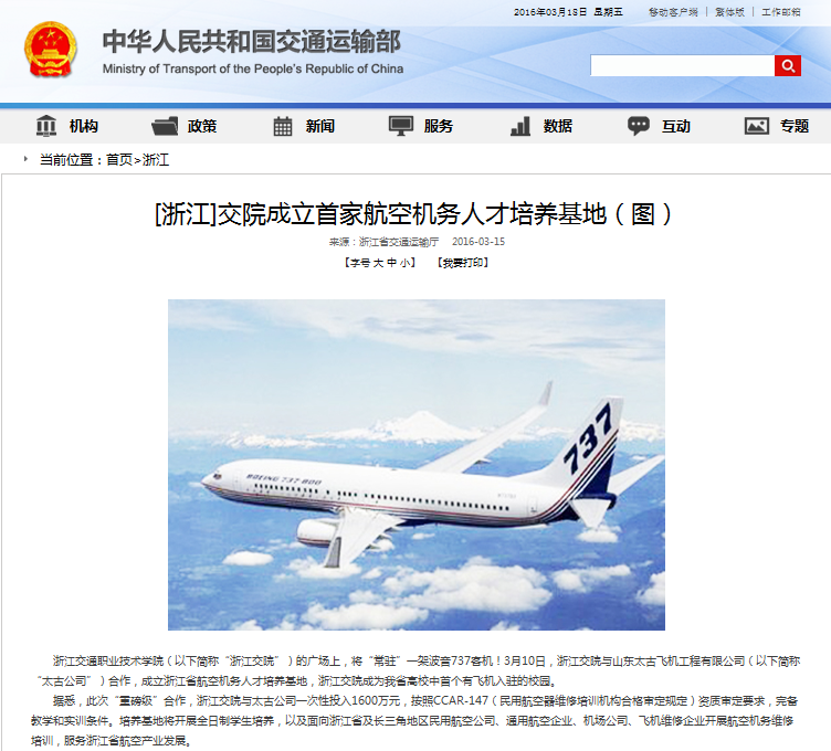 交通运输部网站聚焦我校成为省内首家航空机务人才培养基地