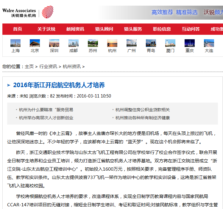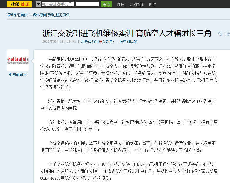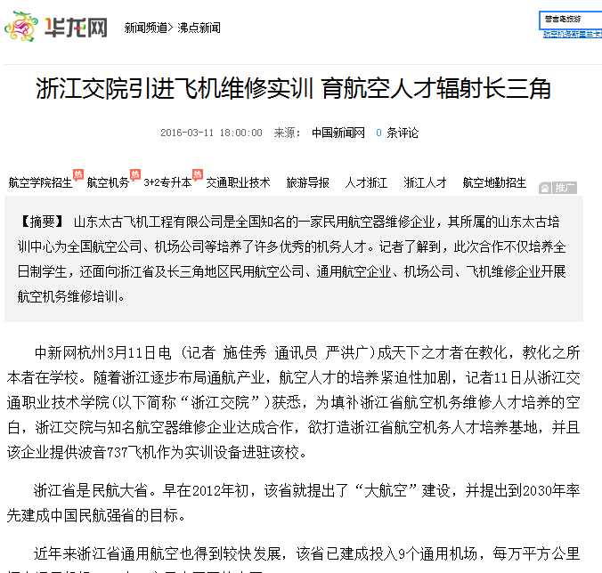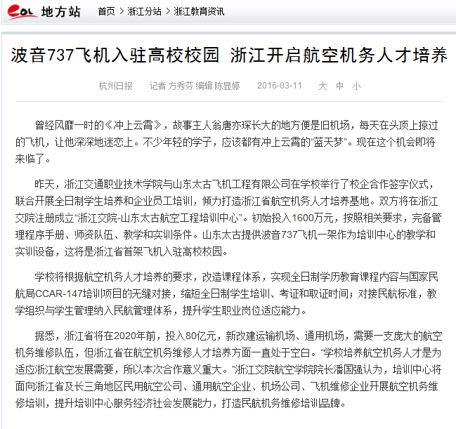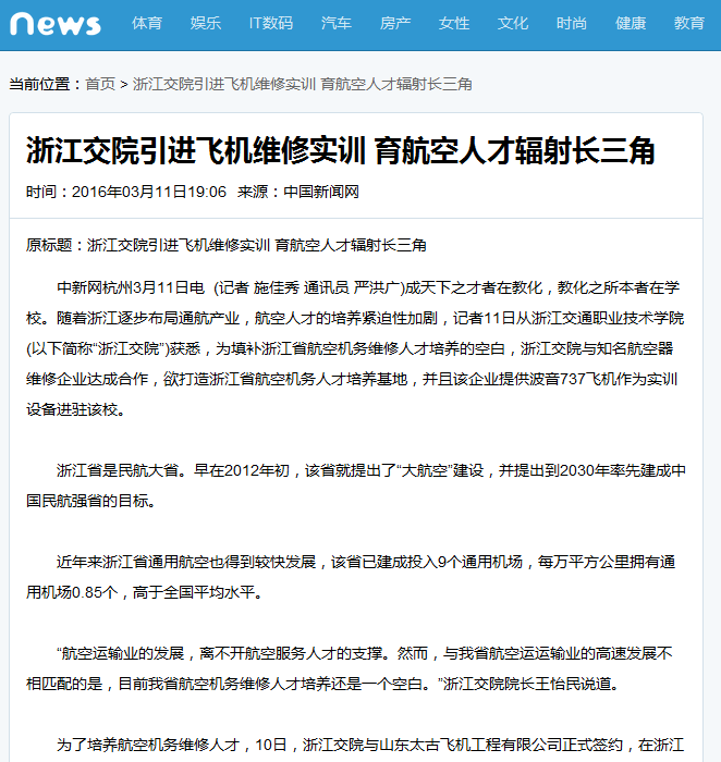 交通运输部网站聚焦我校成为省内首家航空机务人才培养基地