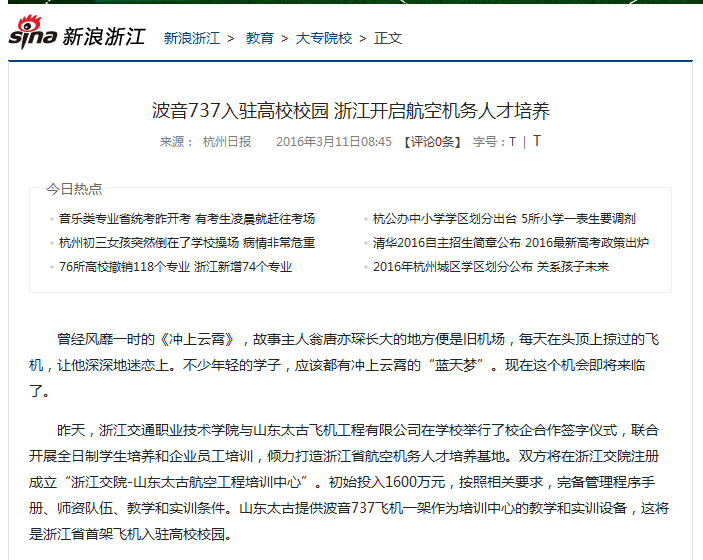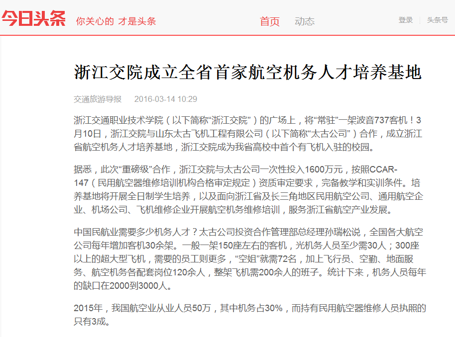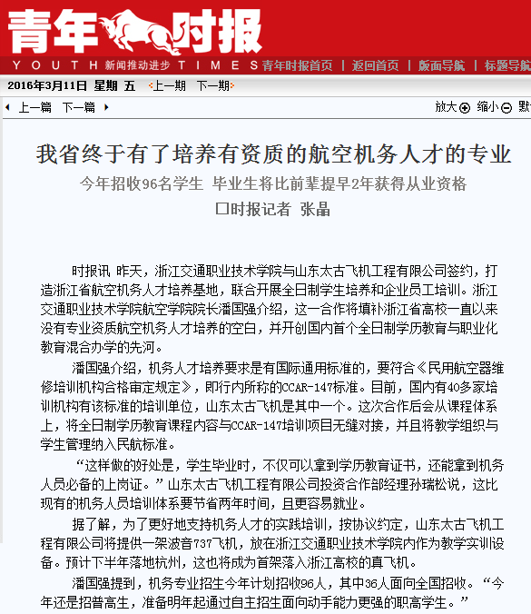 《交通旅游报》报道我校与山东太古工程有限公司校企合作签约仪式