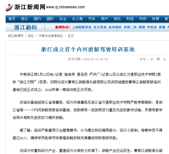 《绍兴日报》等媒体报道我校曹娥江游艇驾驶培训基地成立